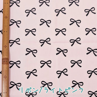 ライトピンクの下地に黒いリボンが並んだ可愛らしい生地です。